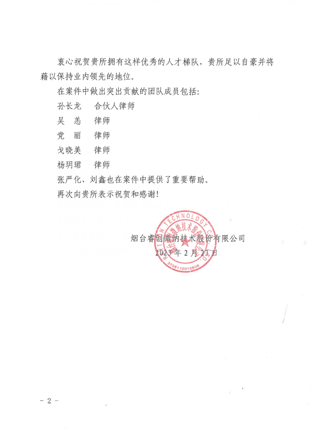 图1 睿创集团向乐球直播寄送的表扬信